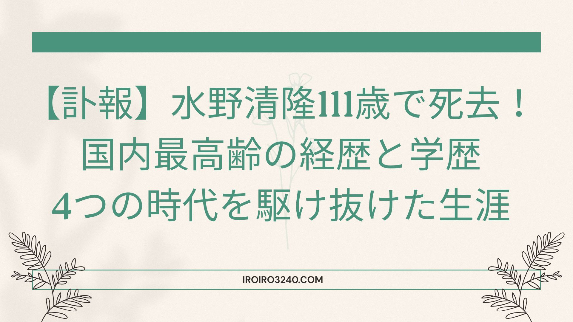 こんにちは♪静岡県磐田市に住む、国内最高齢の男性、水野清隆さんが2026年2月8日(日)に老衰のため、111歳で亡くなりました。 2025年年の3月に「物事を苦にしないことが一番大事じゃないですかね」と長生きの秘訣をおっしゃっていました。日本のスーパーセンテリアン、水野清隆さんがどんな人だったのか?経歴に学歴に調査しました。