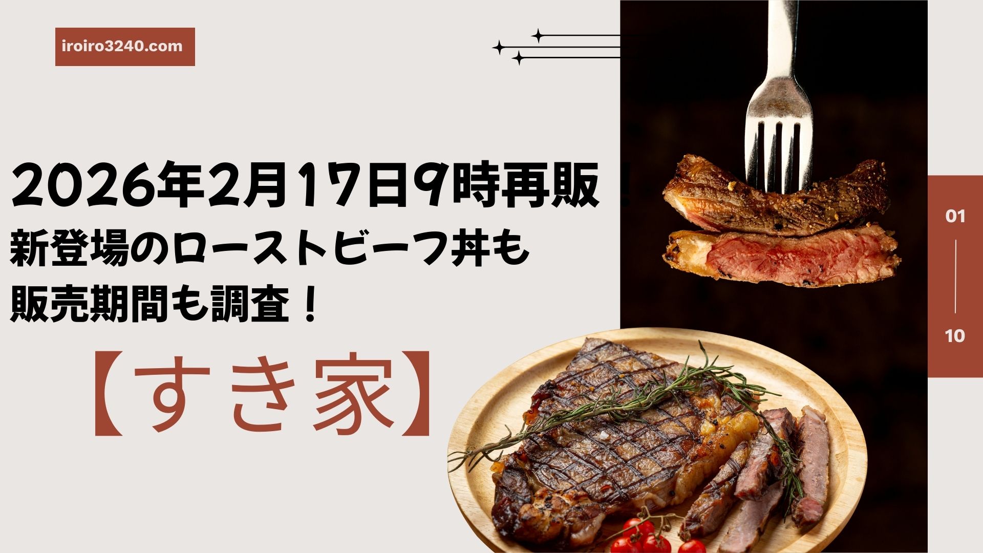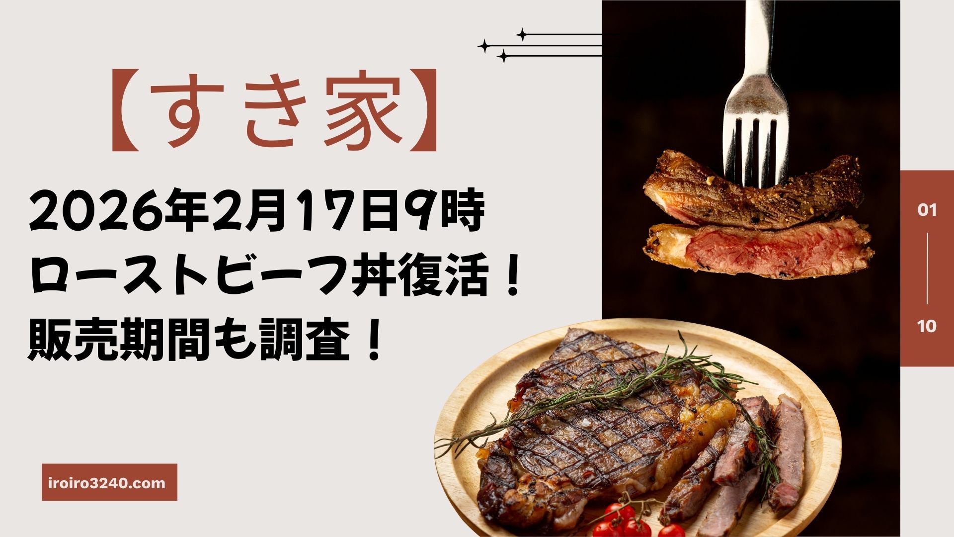 こんにちは♪ローストビーフ丼を愛してやまない管理人のいろです。今回は、大人気だった「すき家」のローストビーフ丼がの再販が決定しました。2026年2月17日(火)9時~から復活販売されます。